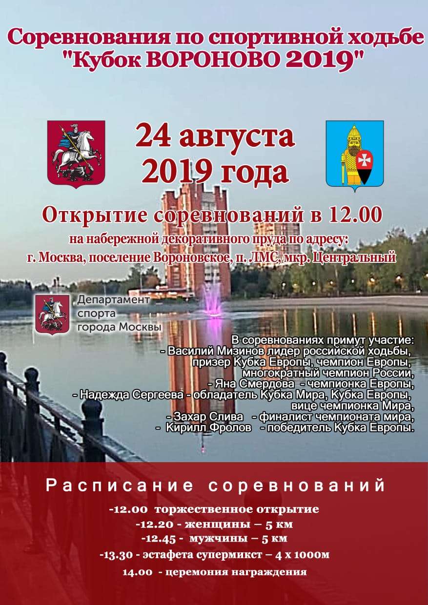 Завтра в 12:00 на территории села Вороново Троицкого административного округа города Москвы пройдет “Кубок Вороново-2019” по спортивной ходьбе – традиционное соревнование, которое проводится с 2010 года. Раньше этот старт входил в Европейский календарь и назывался European Area Permit Meeting of Race Walking «VORONOVO CUP», приезжали сильнейшие ходоки Европы, в том числе любимица местной публики, теперь уже бронзовый призер чемпионата мира 2017 Антонелла Пальмисано. Данные соревнования являются инициативой администрации поселения Вороновское и лично Главы администрации Евгения Павловича Иванова. В этом году поселению исполняется 60 лет и новенькая, отремонтированная трасса для соревнований по спортивной ходьбе стала подарком к юбилею поселения Вороновское.