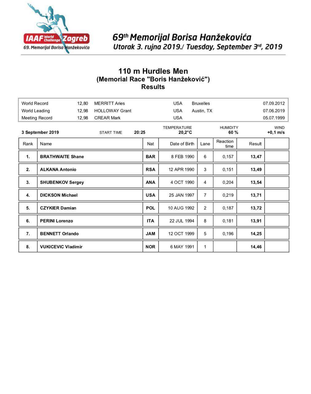 Сергей Шубенков стал третьим в беге на 110 метров с барьерами с результатом 13,54. Золото завоевал представитель Барбадоса Шейн Бертвейт (13,47), серебро досталось южно-африканскому легкоатлету Антонио Алкана (13,49).