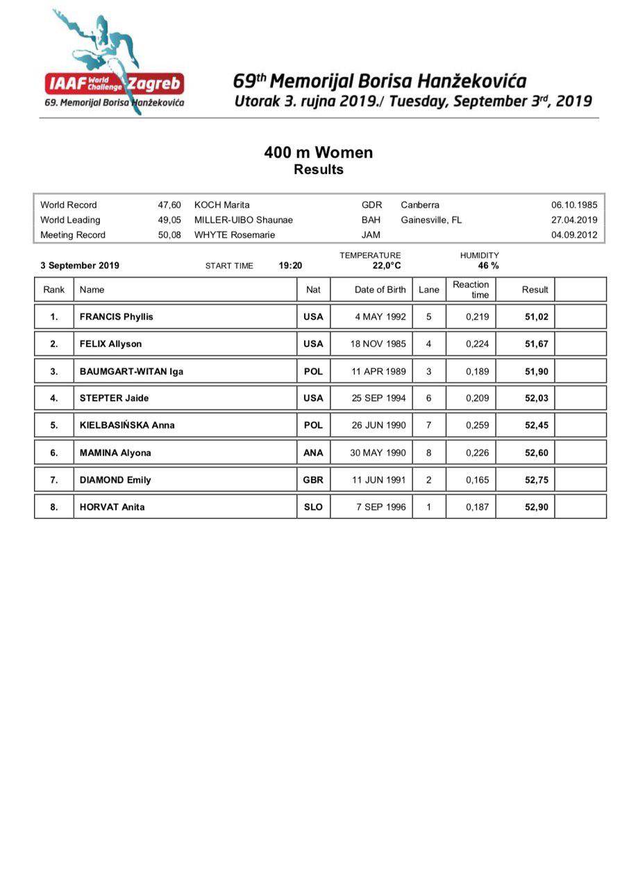 Россиянка Алена Мамина заняла шестое место на соревнованиях в Загребе в беге на 400 м , показав 52,60. Золото турнира у американки Филлис Фрэнсис (51,02), серебро у Эллисон Феликс (51,67), бронза у польской легкоатлетки Иги Баумгарт-Витан (51,90). ⠀